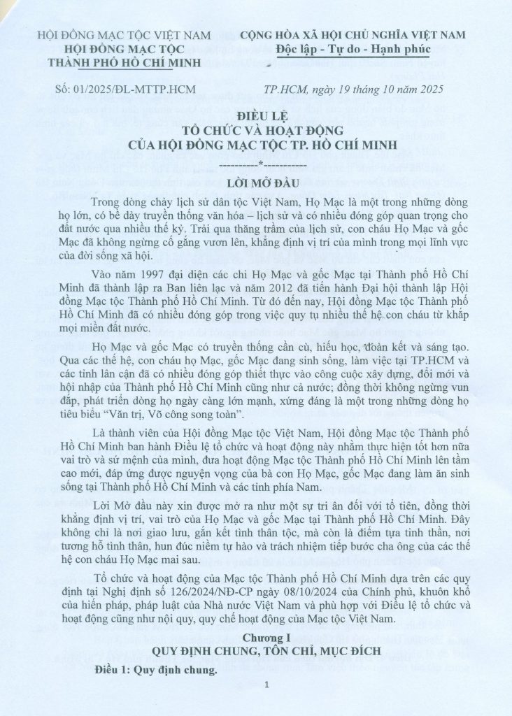 - ĐIỀU LỆ TỔ CHỨC VÀ HOẠT ĐỘNG – QUY CHẾ TỔ CHỨC VÀ HOẠT ĐỘNG (DỰ THẢO) CỦA HỘI ĐỒNG MẠC TỘC TP.HCM KHÓA IV – NHIỆM KỲ 2025 – 2030