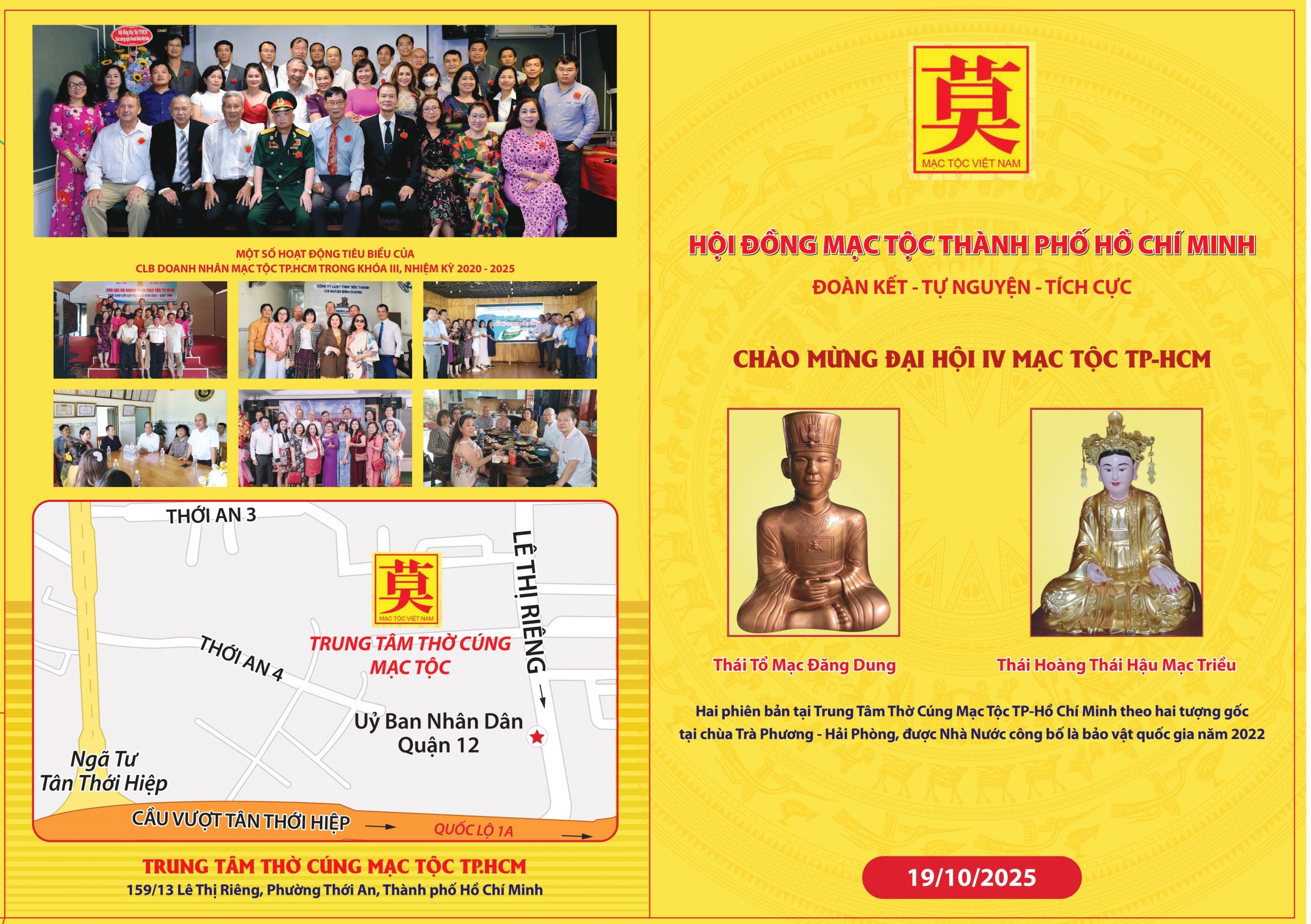 Ngày 19/10/2025, tại Nhà khách T67 (TP.HCM), Đại hội Đại biểu Mạc Tộc TP.HCM Khóa IV, nhiệm kỳ 2025 – 2030 đã long trọng diễn ra trong không khí đoàn kết, nghĩa tình và hướng về cội nguồn. Đại hội có sự tham dự của các đại diện Hội đồng Mạc Tộc Việt Nam, Viện Lịch sử Dòng họ, các đoàn đại biểu Mạc Tộc địa phương cùng đại diện nhiều dòng họ bạn (ông Hoàng Long Vân – Viện phó, ông Nguyễn Văn Minh; HĐDH.Vũ – Võ Phương Nam – TP.HCM: Vũ Ngọc Thạch – Chủ tịch, Vũ Hữu Chính – PCT; CLB.Bách gia Tinh hoa: Bà Nguyễn Thị Châu Linh – Chủ nhiệm; Đại diện họ Trần, họ Hoàng-Huỳnh TP.HCM).