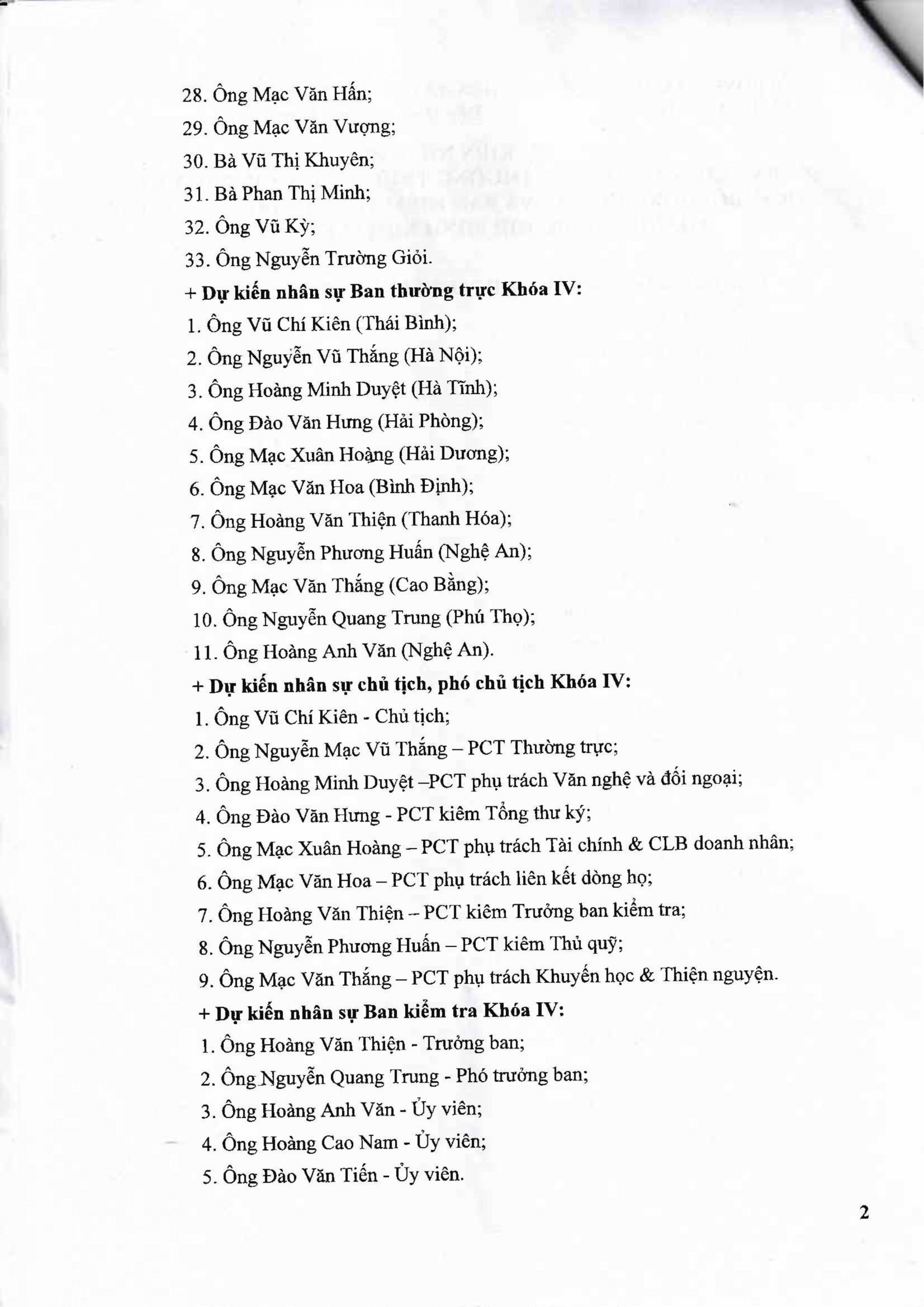 – Các Phó Chủ tịch gồm: Ông Nguyễn Mạc Vũ Thắng (Thường trực), Ông Hoàng Minh Duyệt, Ông Đào Văn Hưng, Ông Mạc Xuân Hoàng, Ông Mạc Văn Hoa, Ông Hoàng Văn Thiện, Ông Nguyễn Phương Huấn, và Ông Mạc Văn Thắng.
