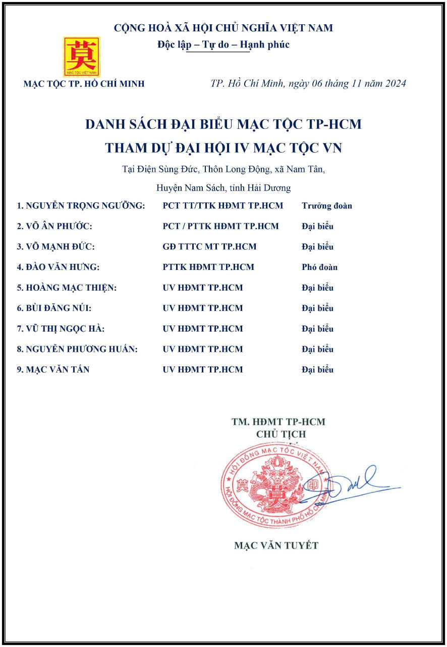 Sáng ngày 10/11/2024 (ÂL ngày 10/10 năm Giáp Thìn), tại Điện Sùng Đức xã Nam Tân – Tổ đường Mạc Tộc Việt Nam, Hội đồng Mạc tộc Việt Nam tổ chức “Đại hội đại biểu Toàn quốc Mạc Tộc Việt Nam khóa IV, nhiệm kỳ 2024 – 2029”, gần 600 đại biểu là con cháu họ Mạc về dự, trong đó đại diện Hội đồng Mạc tộc TP.HCM có 9 người tham dự, trưởng đoàn là ông Nguyễn Trọng Ngưỡng – PCT TT / TTK HĐMT TP.HCM cùng các thành viên: