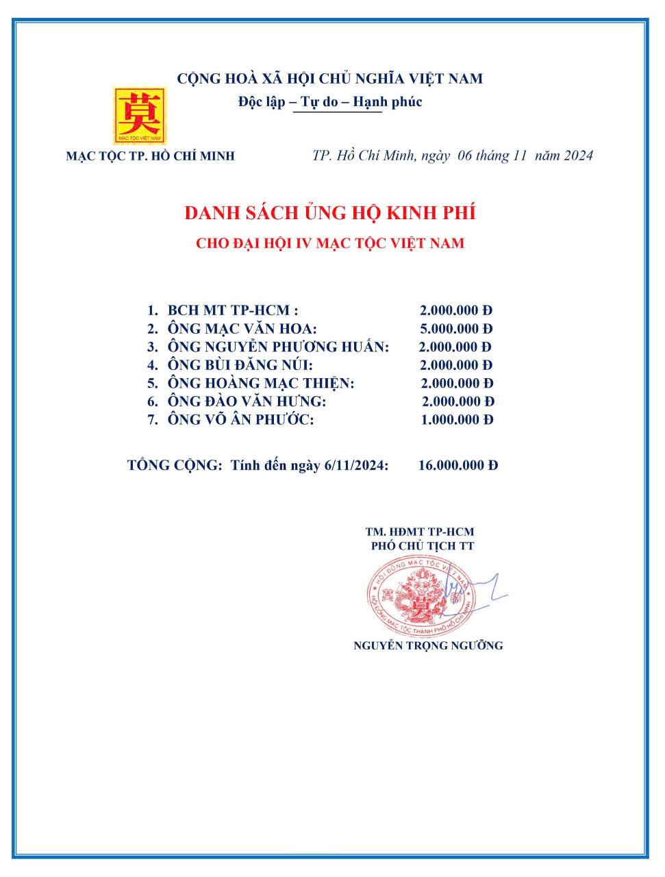 Các cá nhân Hội đồng Mạc tộc TP.HCM đã đóng góp quỹ trong công tác chuẩn bị Đại hội đại biểu toàn quốc Mạc Tộc Việt Nam.