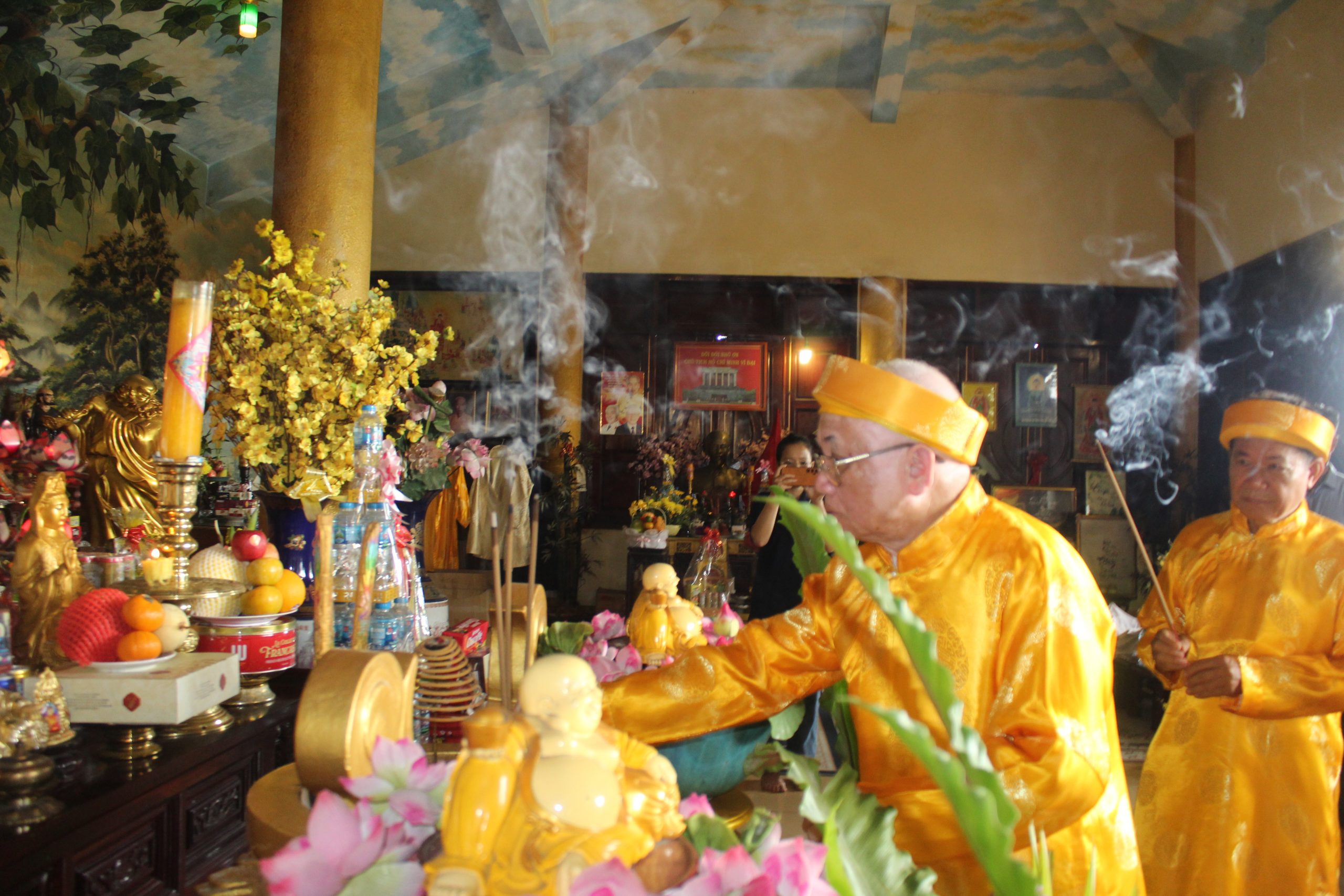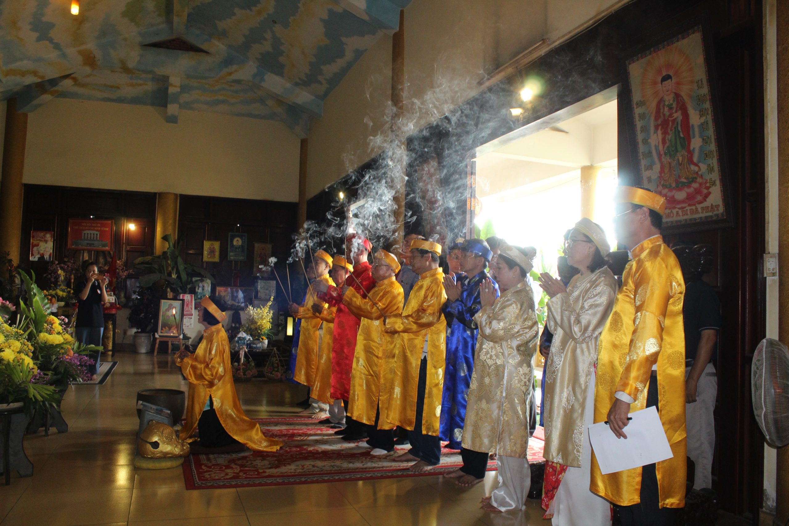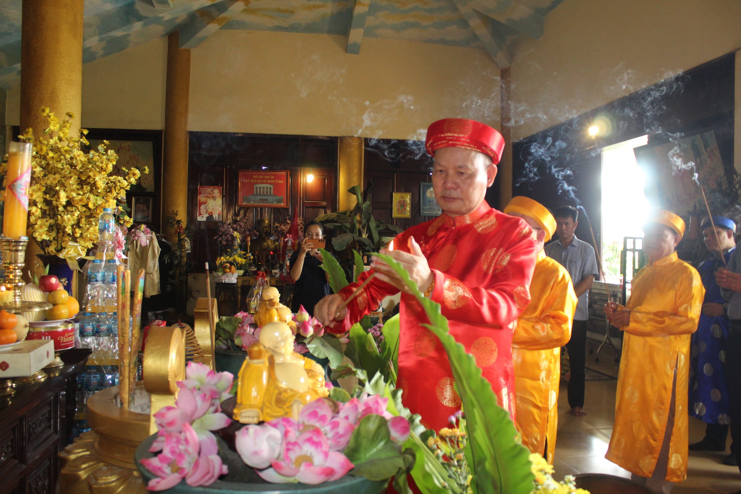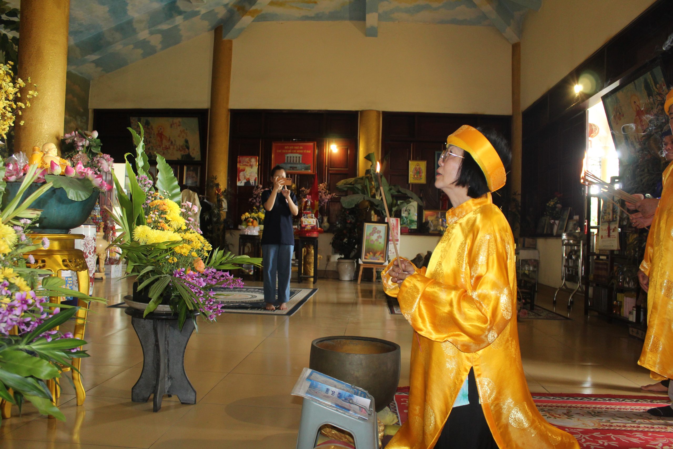 – Bà Nguyễn Thị Ngọc kính cẩn trình lễ trước Đức Bổn Sư và Đức Thái Tổ, mở đầu cho buổi cúng giỗ với không khí linh thiêng và trang trọng.