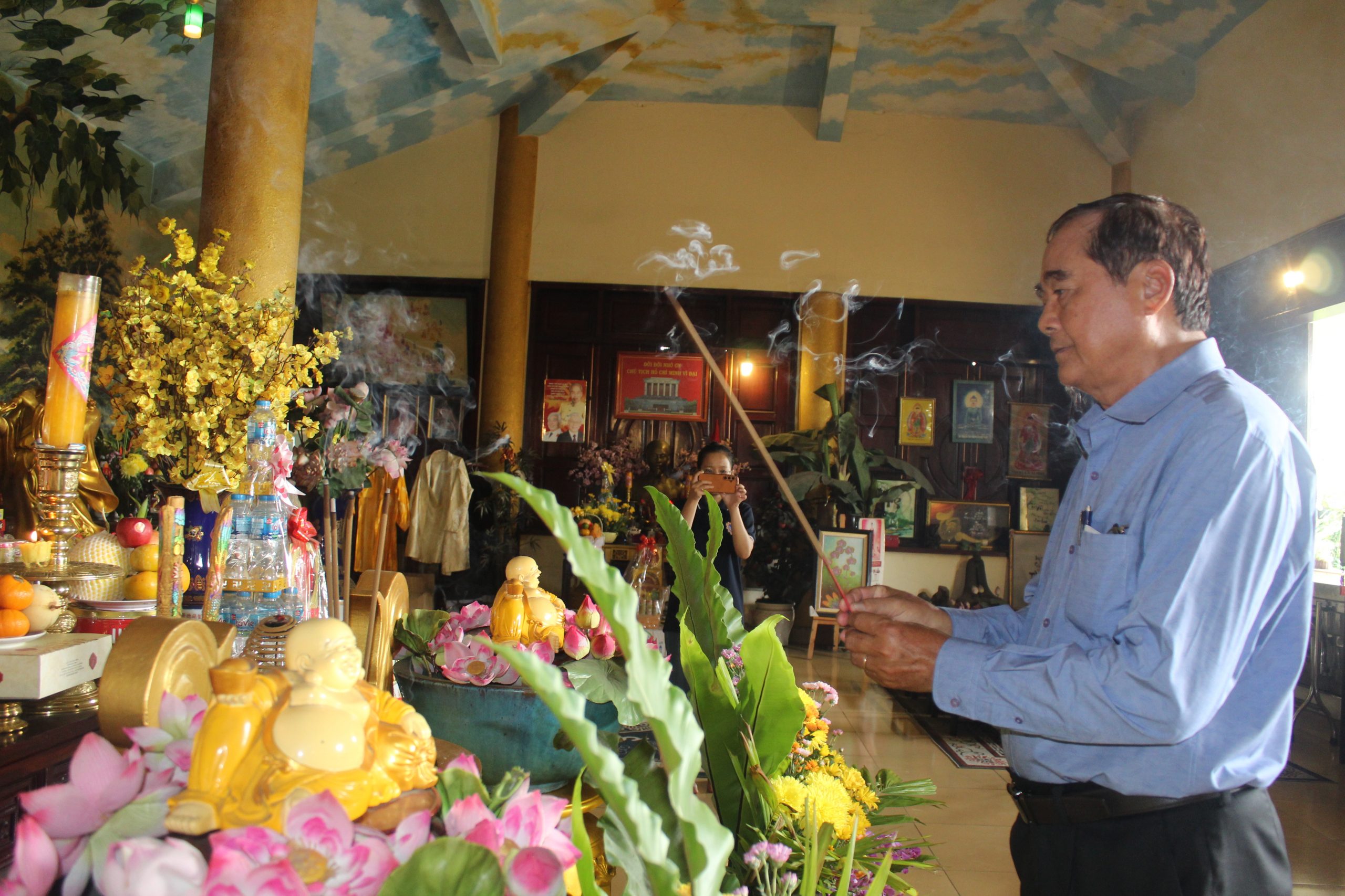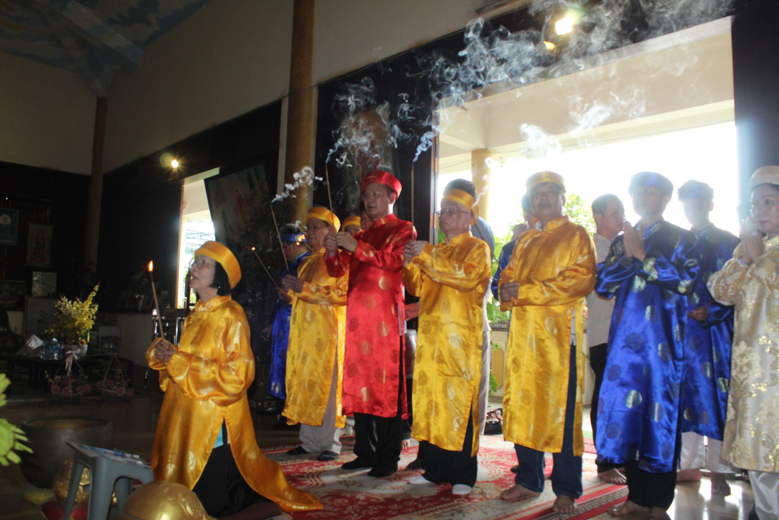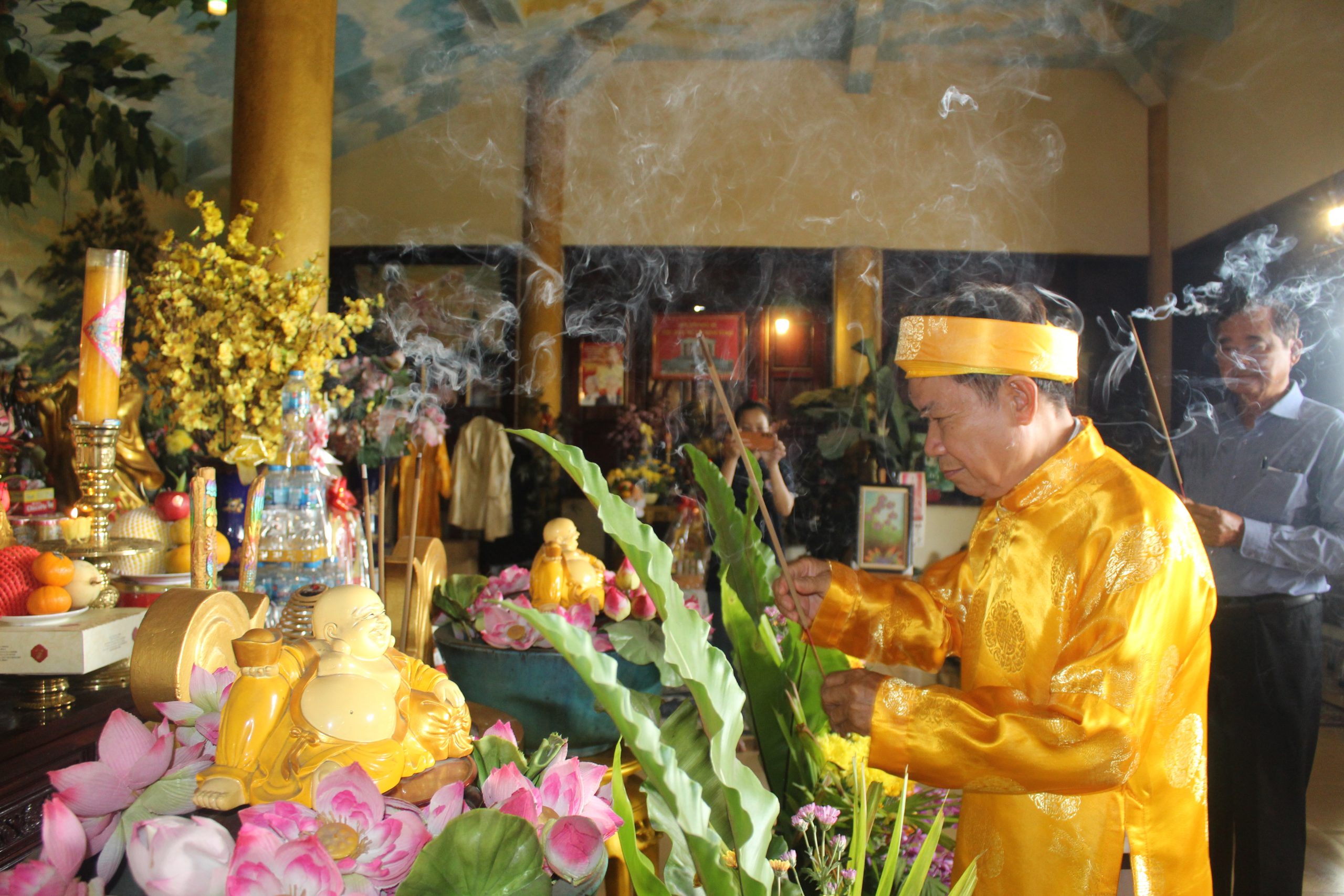– Bà Nguyễn Thị Ngọc kính cẩn trình lễ trước Đức Bổn Sư và Đức Thái Tổ, mở đầu cho buổi cúng giỗ với không khí linh thiêng và trang trọng.
