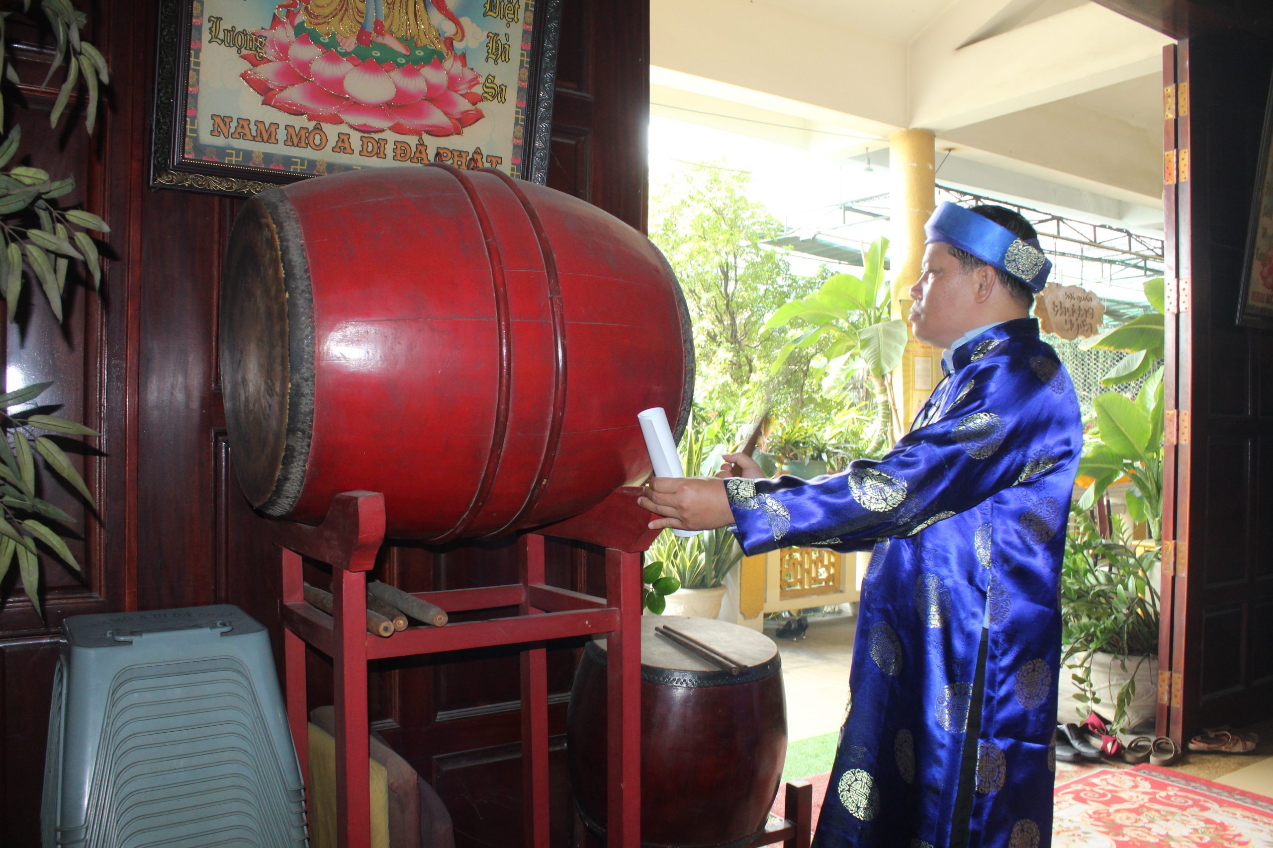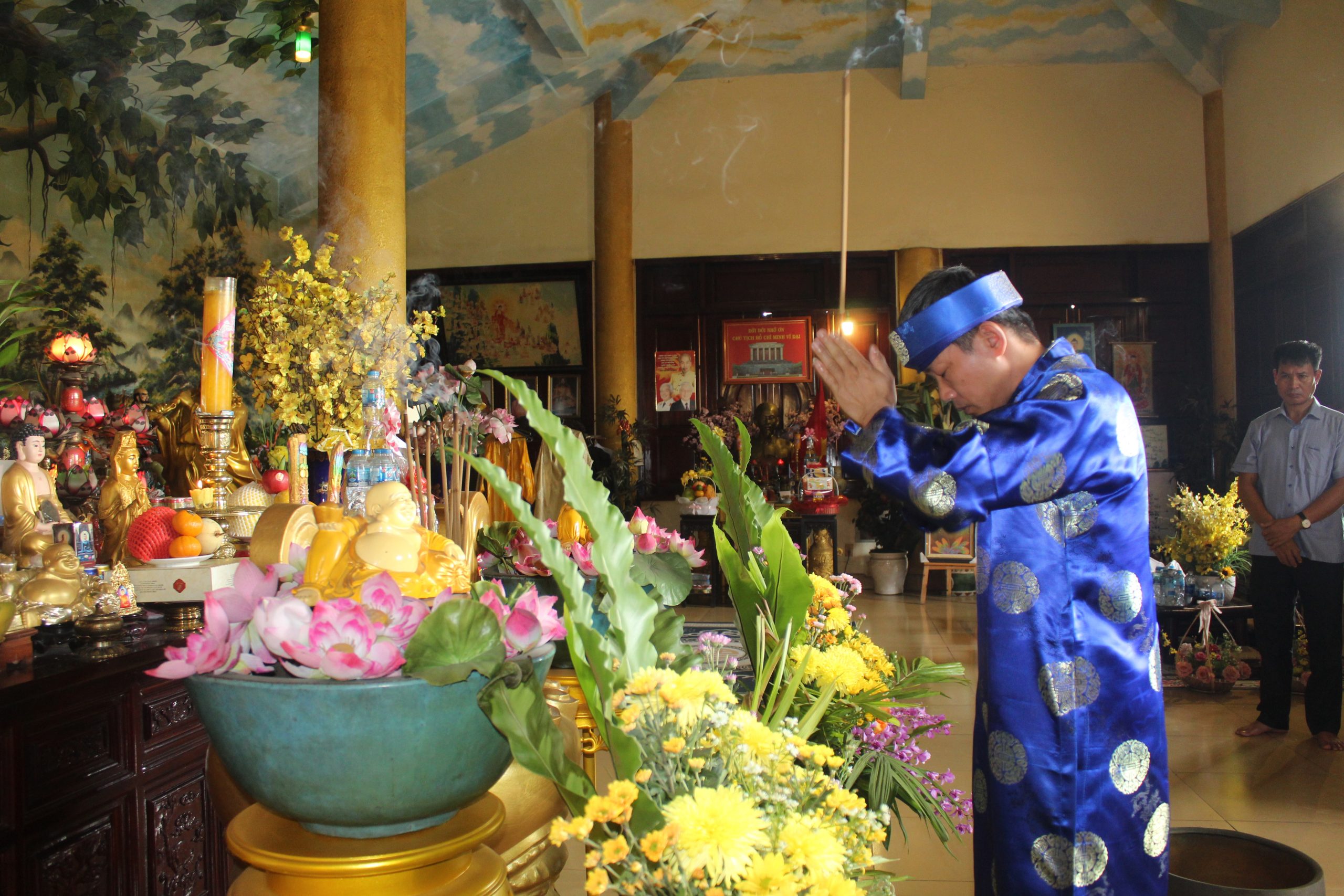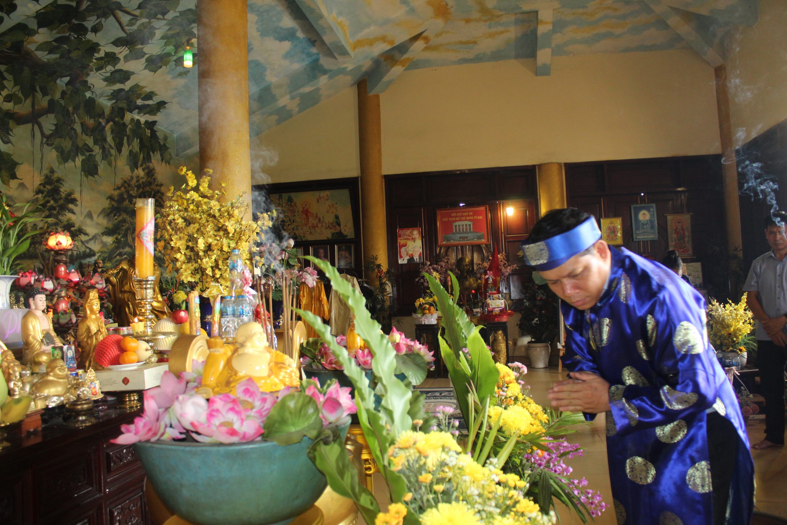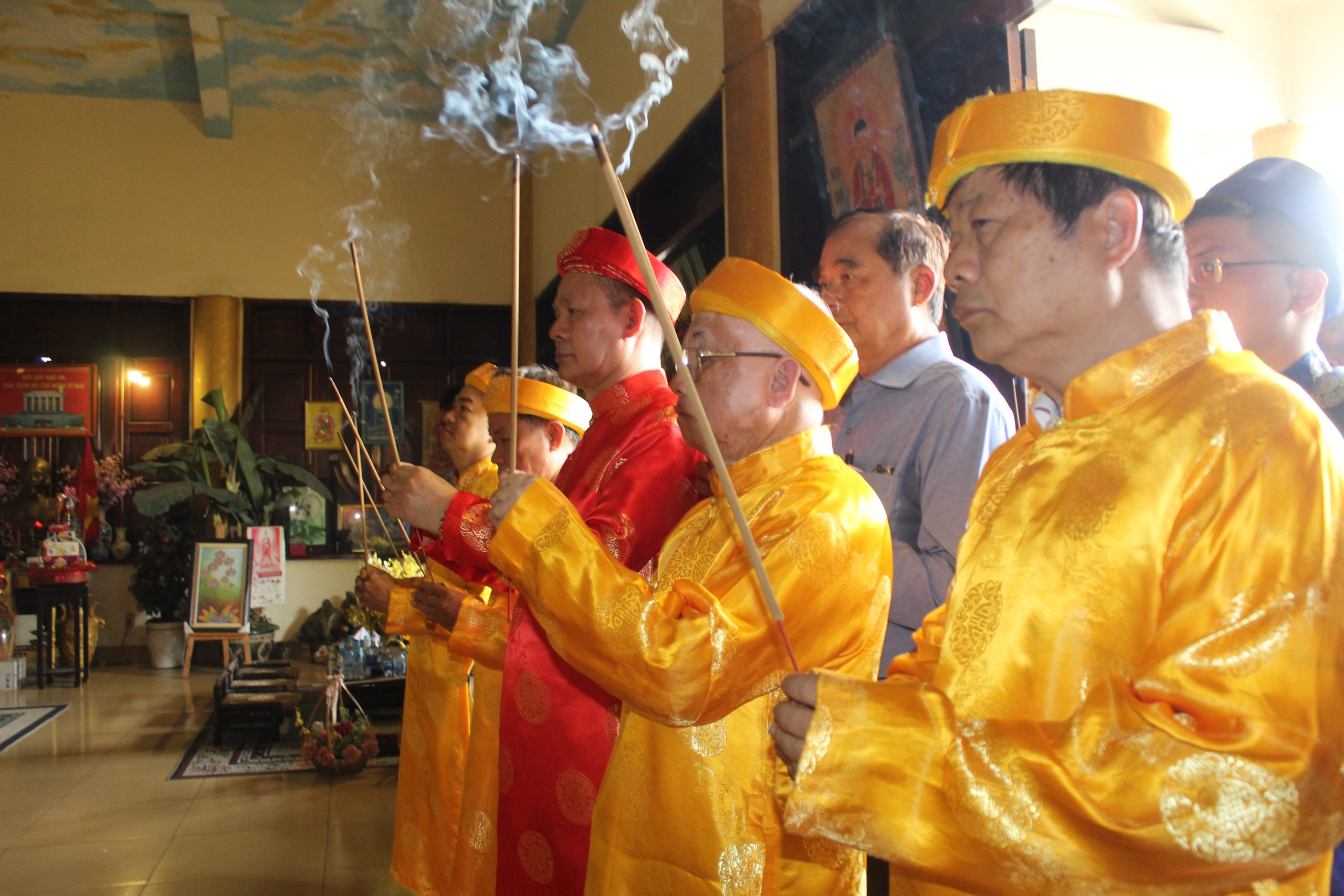 – Bà Nguyễn Thị Ngọc kính cẩn trình lễ trước Đức Bổn Sư và Đức Thái Tổ, mở đầu cho buổi cúng giỗ với không khí linh thiêng và trang trọng.