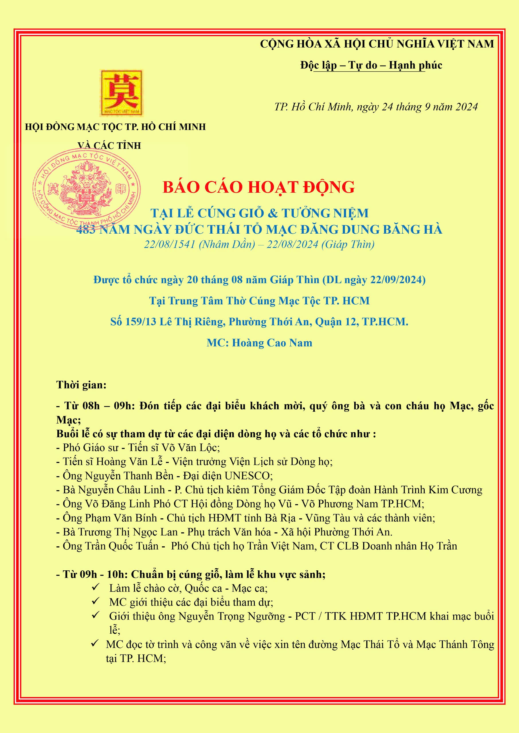 Chủ nhật, ngày 22/09/2024 (nhằm ngày 20/08 năm Giáp Thìn), HĐMT TP.HCM / Trung Tâm Thờ Cúng Mạc Tộc TP.HCM tổ chức Lễ cúng giỗ – Tưởng niệm 483 năm ngày Đức Thái Tổ Mạc Đăng Dung.