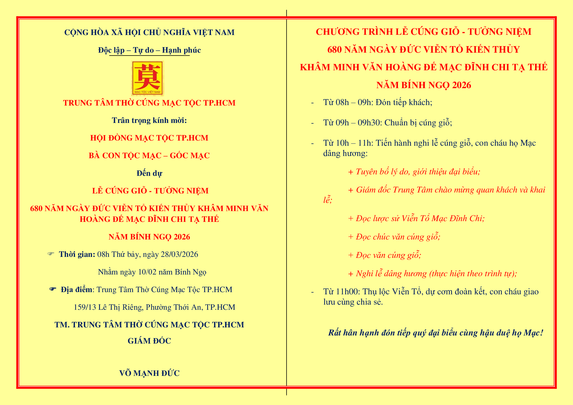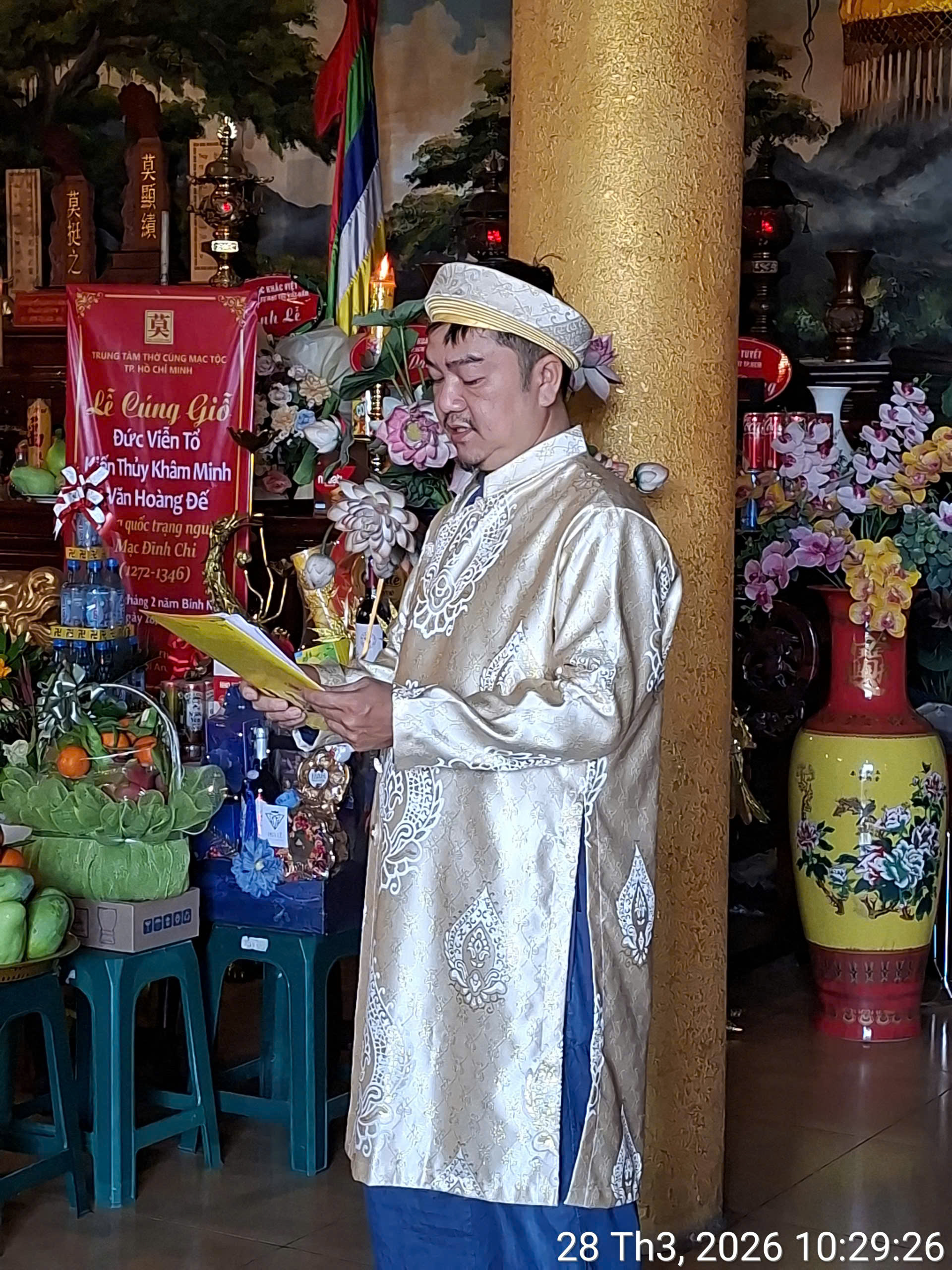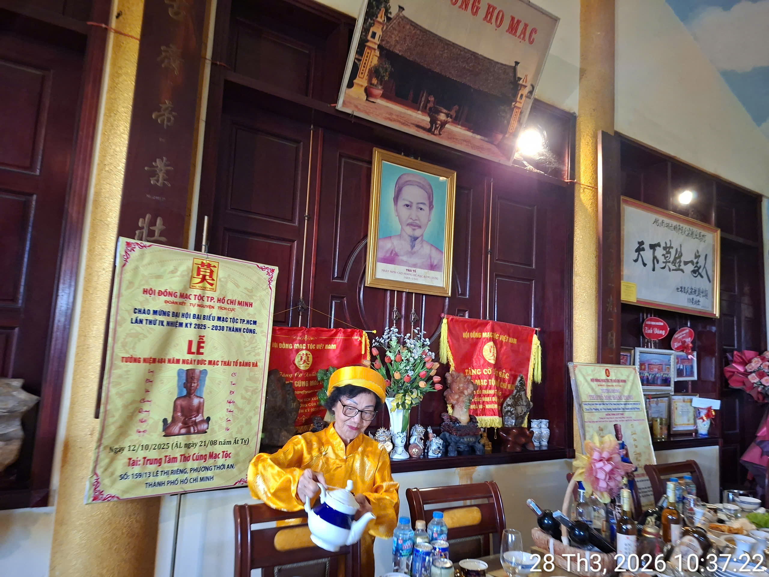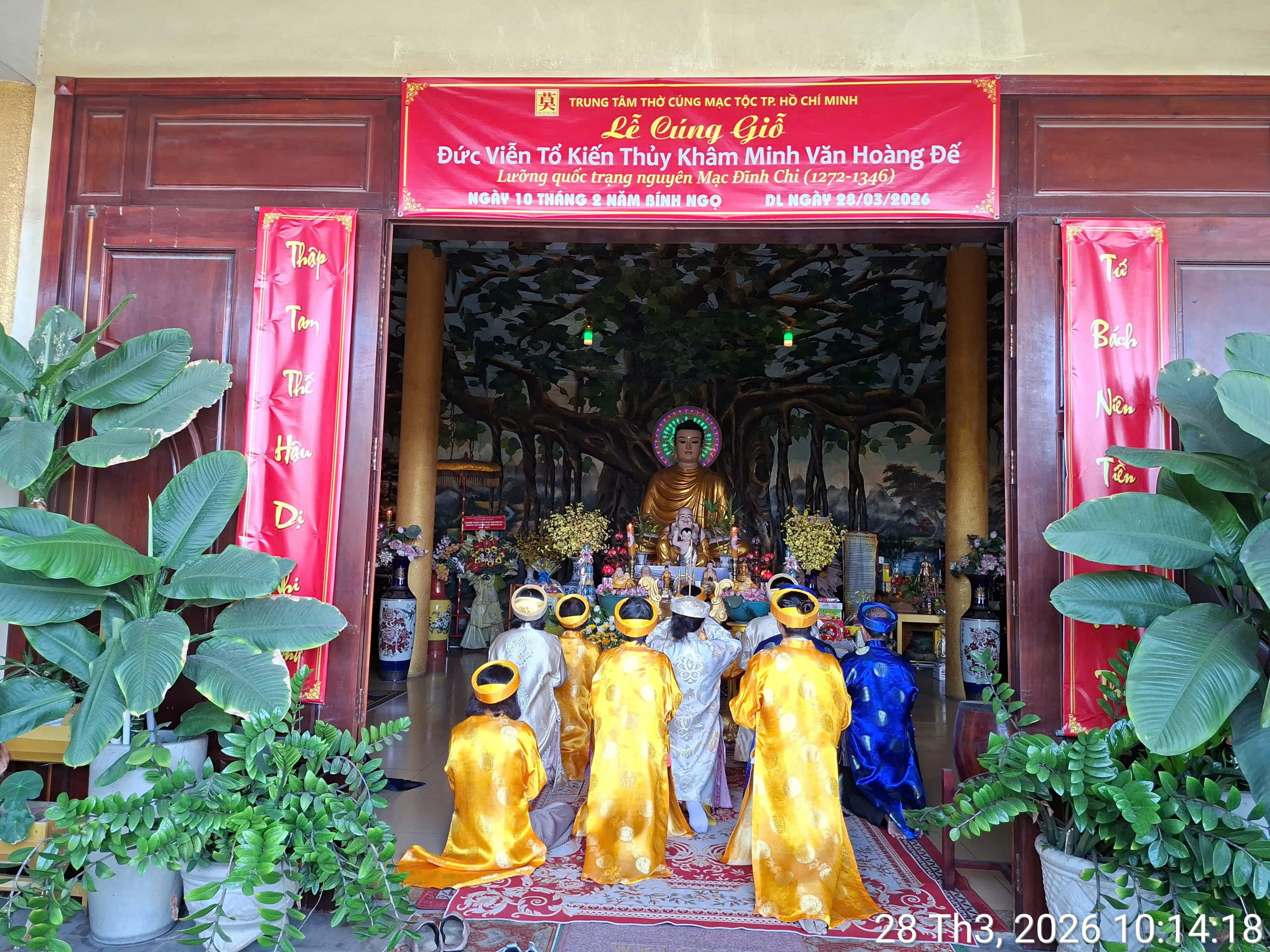 Ngày 28/03/2026 (Mùng 10/02 năm Bính Ngọ), tại Trung Tâm Thờ Cúng Mạc Tộc TP.HCM đã trang nghiêm diễn ra Lễ cúng giỗ Viễn Tổ Mạc Đĩnh Chi. Buổi lễ là dịp để con cháu họ Mạc – gốc Mạc gần xa cùng trở về hội tụ, tưởng nhớ công đức tổ tiên và thắt chặt tình thân tộc.