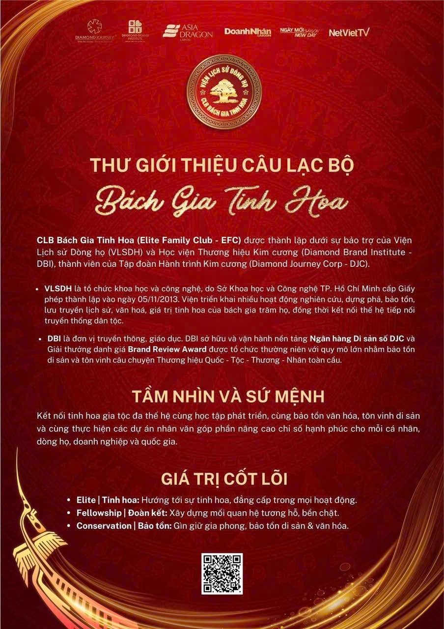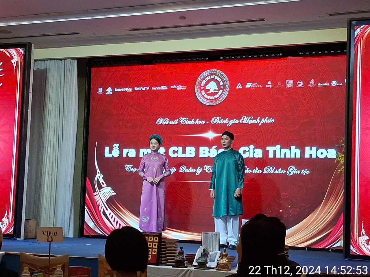 Trong buổi lễ, Tiến sĩ Hoàng Văn Lễ, Viện trưởng Viện Lịch sử Dòng họ, đã chính thức trao quyết định thành lập Câu lạc bộ Bách Gia Tinh Hoa cho Ban Chủ nhiệm. Ban chấp hành khóa I của Câu lạc bộ, do Thạc sĩ Nguyễn Châu Linh làm Chủ nhiệm cũng ra mắt với sứ mệnh kết nối và gìn giữ kết nối tinh hoa văn hóa các dòng họ Việt Nam. Đặc biệt, Ban chấp hành đã giới thiệu cuốn sách “Gia phả học tinh hoa” – một tài liệu quý giá nhằm hệ thống hóa và lan tỏa những giá trị di sản văn hóa dòng họ đến cộng đồng.