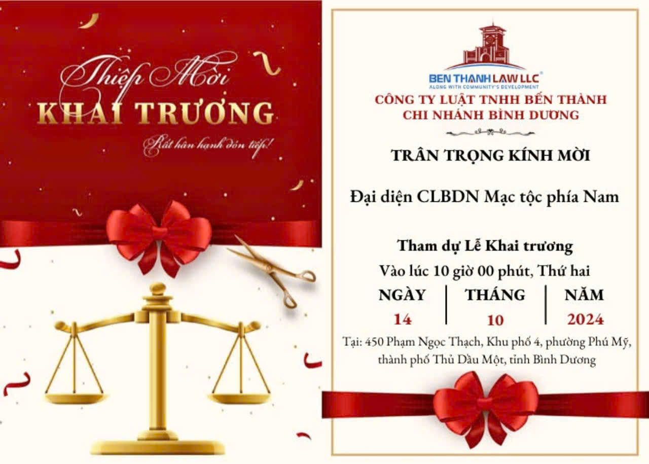 Ngày 14/10/2024, các thành viên CLB Doanh nhân Mạc Tộc TP.HCM gồm ông Võ Ân Phước – Phó chủ tịch HĐMT TP.HCM / Phó nhóm CLB Doanh nhân Mạc Tộc TP.HCM; Luật sư Hoàng Anh Tuấn, ông Mạc Đăng Hùng và ông Võ Mạnh Đức đã có mặt tại công ty Luật TNHH Bến Thành – Chi nhánh Bình Dương, tọa lạc tại số 450 Phạm Ngọc Thạch, Khu phố 4, phường Phú Mỹ, TP. Thủ Dầu Một, tỉnh Bình Dương để chúc mừng khai trương.