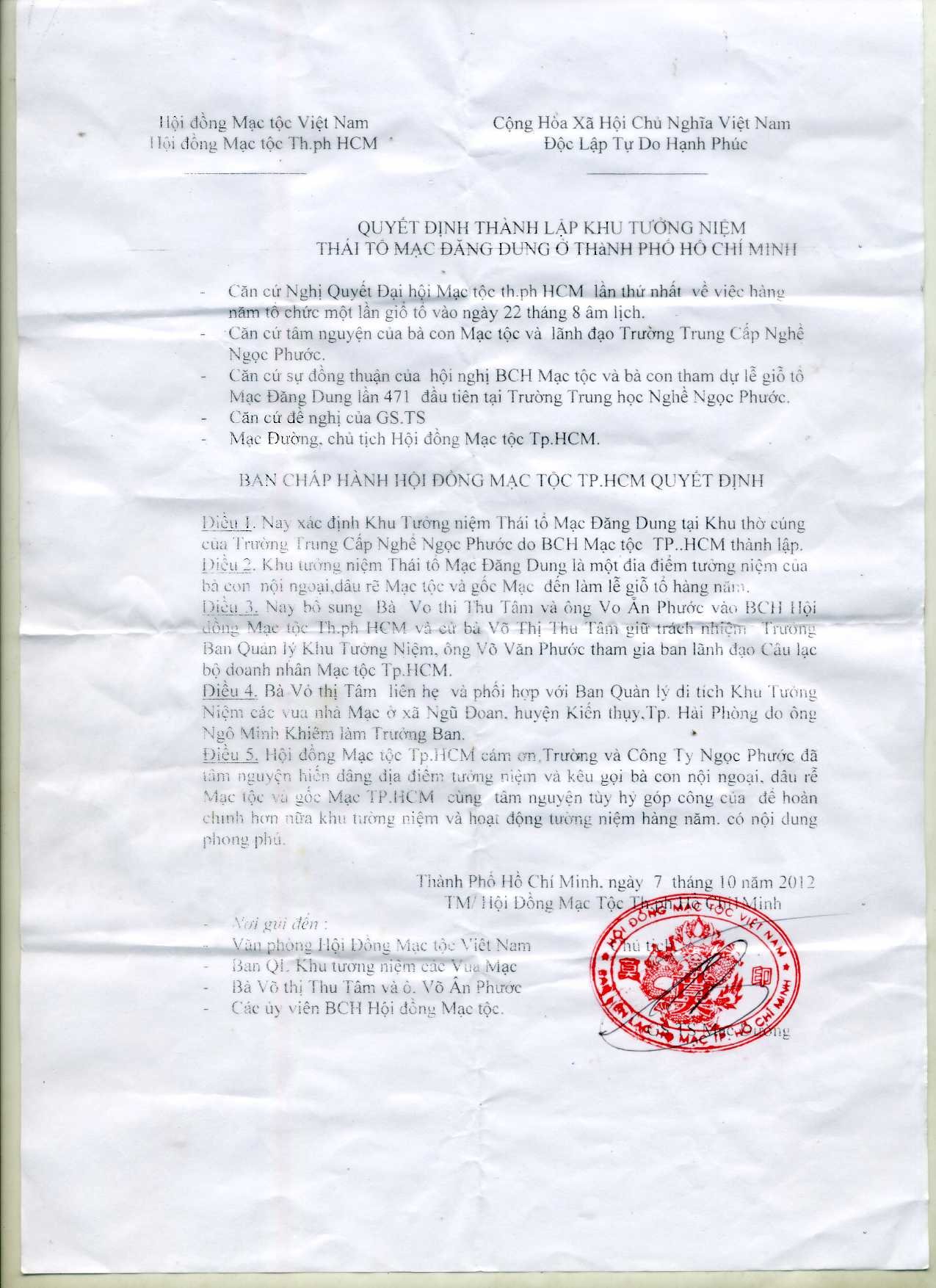 Ngày 12/08/2012, đoàn Mạc Tộc TP.HCM gồm Giáo sư Mạc Đường, ông Nguyễn Trọng Ngưỡng, ông Vũ Chí Kiên và các thành viên khác đến và dâng hương. Đón tiếp đoàn là ông Võ Ân Phước và bà Võ Thị Thu Tâm . Tại đây, GS.TS Mạc Đường – Chủ tịch Hội đồng Mạc tộc Tp. Hồ Chí Minh chủ trì buổi họp chuẩn bị lễ giỗ Mạc Thái Tổ năm 2012 tại Trường Ngọc Phước. Tại buổi giỗ đã đọc quyết định thành lập Khu Tưởng Niệm Mạc Thái Tổ tại khu Tâm Linh Trường TC Ngọc Phước là của HĐMT TP.HCM.